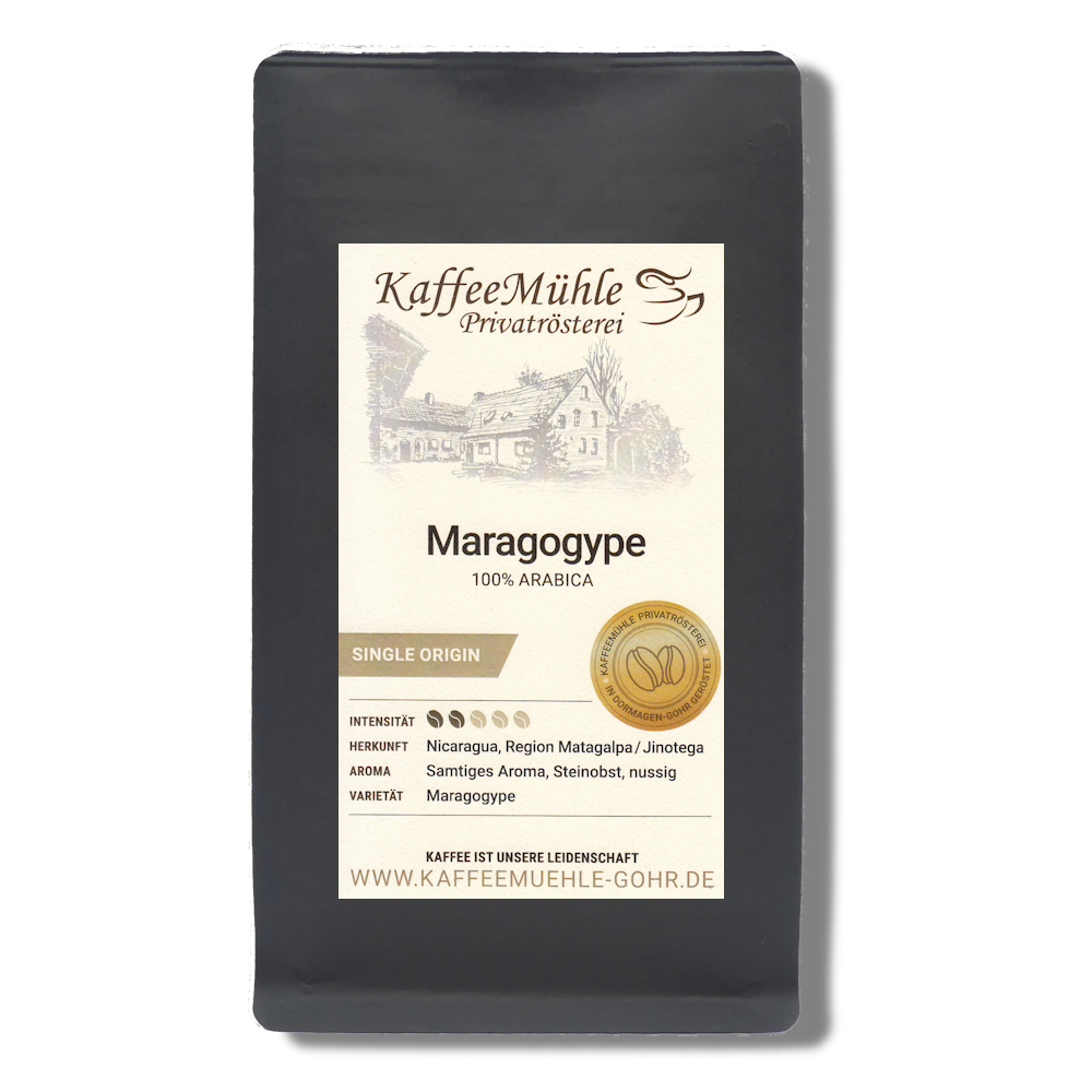 Diese Kombination aus Höhenlage, Mikroklima und mineralstoffreichen Böden verleiht dem Maragogype-Kaffee seine außergewöhnliche Qualität. Die Sorte Maragogype – oft auch als „Elefantenbohne“ bekannt – ist berühmt für ihre besonders großen Bohnen, die viel Raum für feine Geschmacksnuancen bieten. In der Tasse überzeugt dieser Kaffee mit einer ausgewogenen Säure, weichen Körperstruktur und Noten von Karamell, Nuss und floralen Akzenten.
