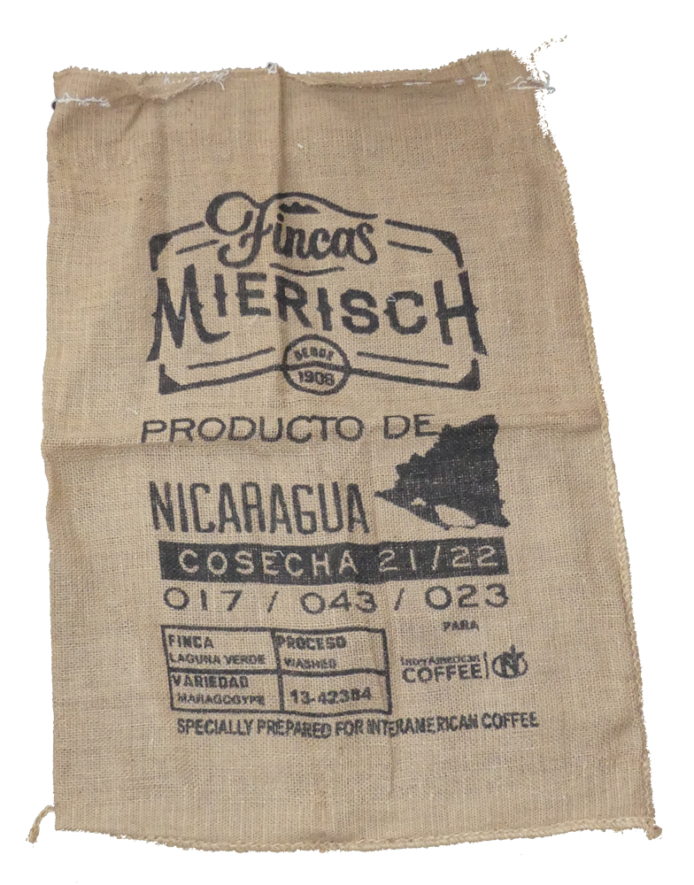 Dieser originale Kaffeesack stammt von der angesehenen Kaffeeproduzentenfamilie Fincas Mierisch aus den Bergen Nicaraguas. Er wurde zum Transport hochwertiger Spezialitätenkaffees verwendet und besticht durch seinen charakteristischen Aufdruck, die robuste Jutequalität und den unverwechselbaren Charme echter Kaffeekultur.